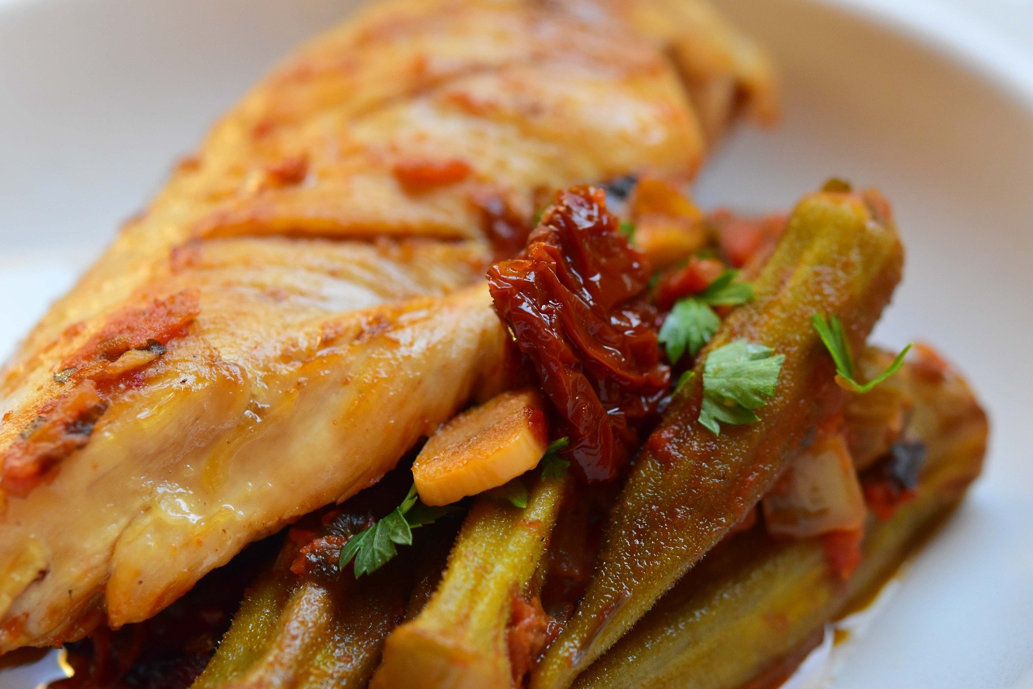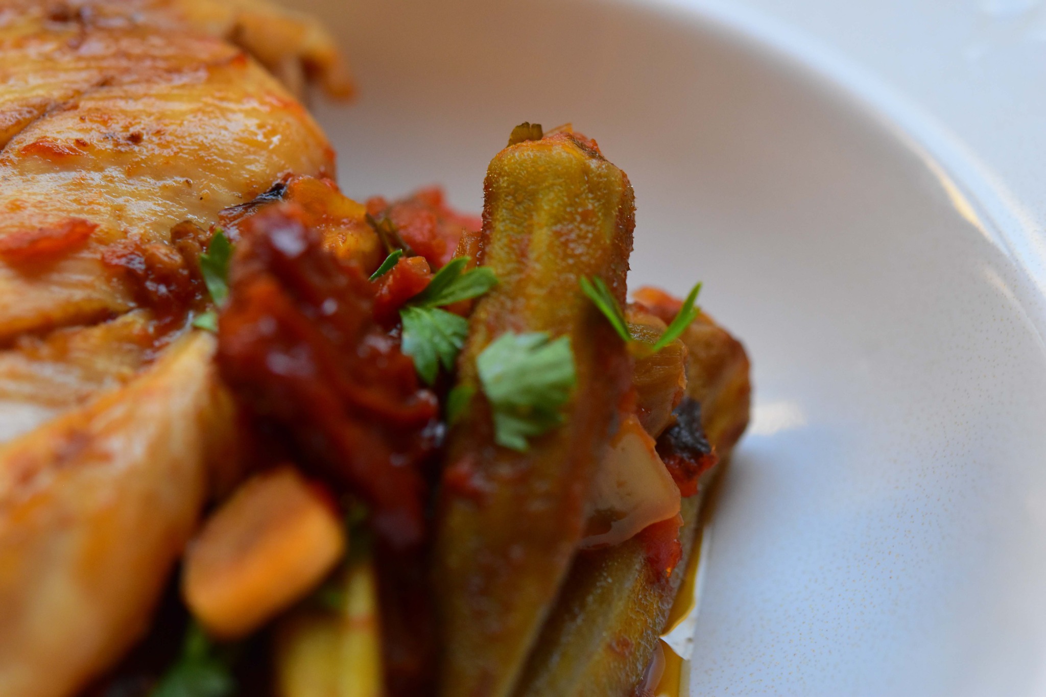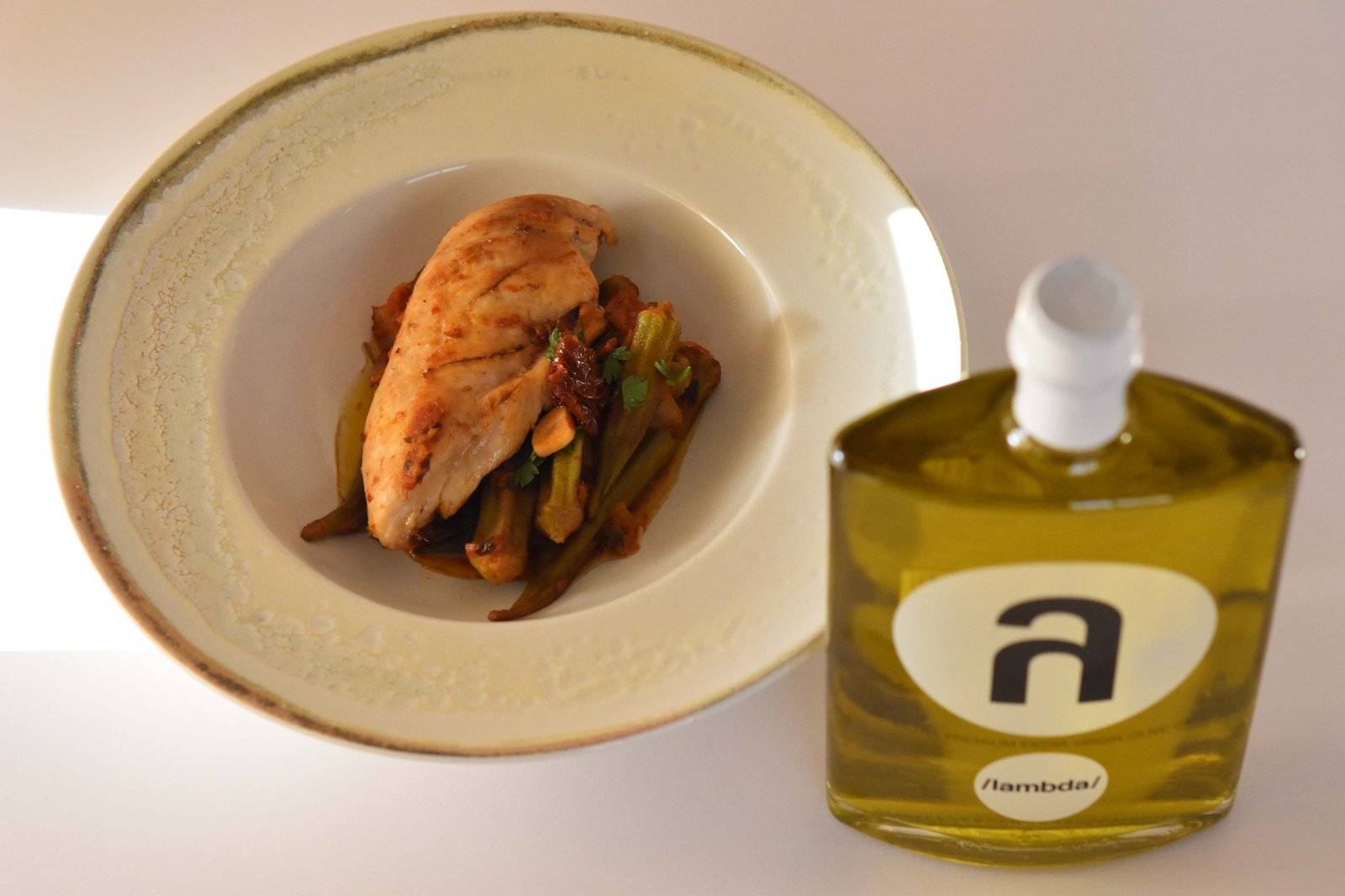 2.Κοτόπουλο με μπάμιες, λ /lambda/ olive oil και λιαστές ντομάτες