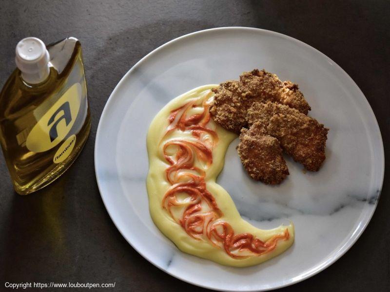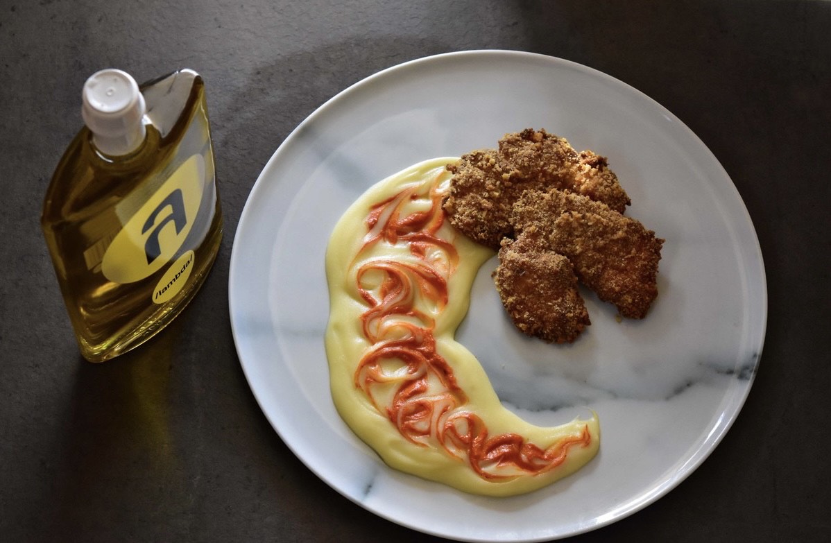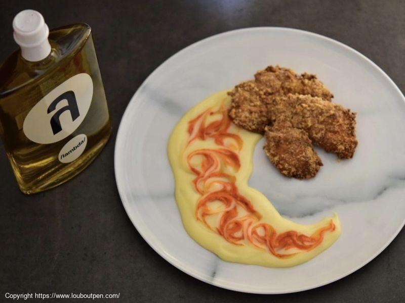 Ε λοιπόν, αυτό το φιλέτο κοτόπουλο, σχεδόν μαριναρισμένο στην πάστα πιπεριάς, παναρισμένο με φρυγανιά και ψημένο στον φούρνο με λ /lambda/ olive oil σε ελάχιστο χρόνο, σήμερα ζήτησε να το συνοδεύσει πουρές πατάτας.